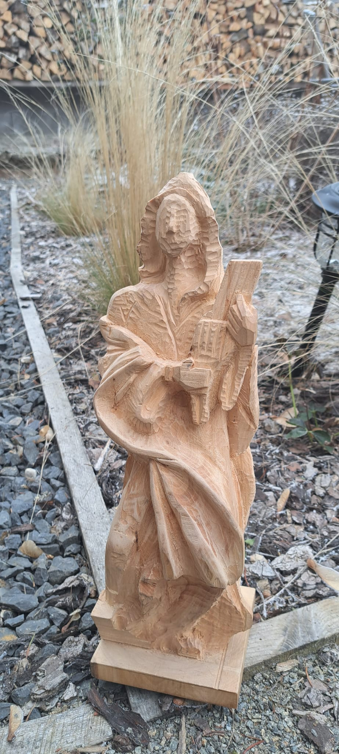 Dřevo jako materiál ve výtvarném umění má řadu výhod. Je poměrně pružné a lehké, cenově dostupné a i snadno zpracovatelné, také je oproti těstu a papíru odolnější. Též má i své nedostatky. Má různé mechanické vlastnosti, dané například směrem vláken či místem růstu a je nestejnorodé. Mění tvar a rozměry sesycháním, borcením a bobtnáním, s čímž se musí počítat. Všechny druhy dřeva jsou různé jakosti, struktury, váhy, vzhledu, barvy i tvrdosti.Výběr druhů dřeva se většinou řídí místními přírodními zdroji. Používá se dřeva, které je poměrně lehce dostupné nebo nejlépe vyhovuje prostředí, do kterého plastika přijde. Všechny druhy dřeva jsou různé jakosti, struktury, barvy, váhy, vzhledu a tvrdosti. Musíme se také citem naučit rozpoznat, k čemu se který druh dřeva hodí a jak jen ho nejvhodněji opracovat. Přitom bereme v úvahu prostředí, výšku a osvětlení místa, kde bude dřevěná plastika stát.